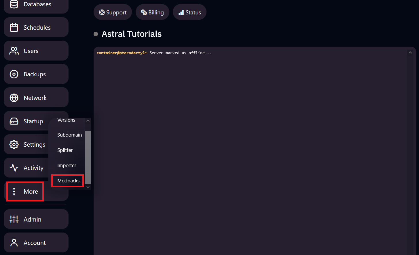 1. Open the modpack installer from your panel. It should be under the "more" tab.