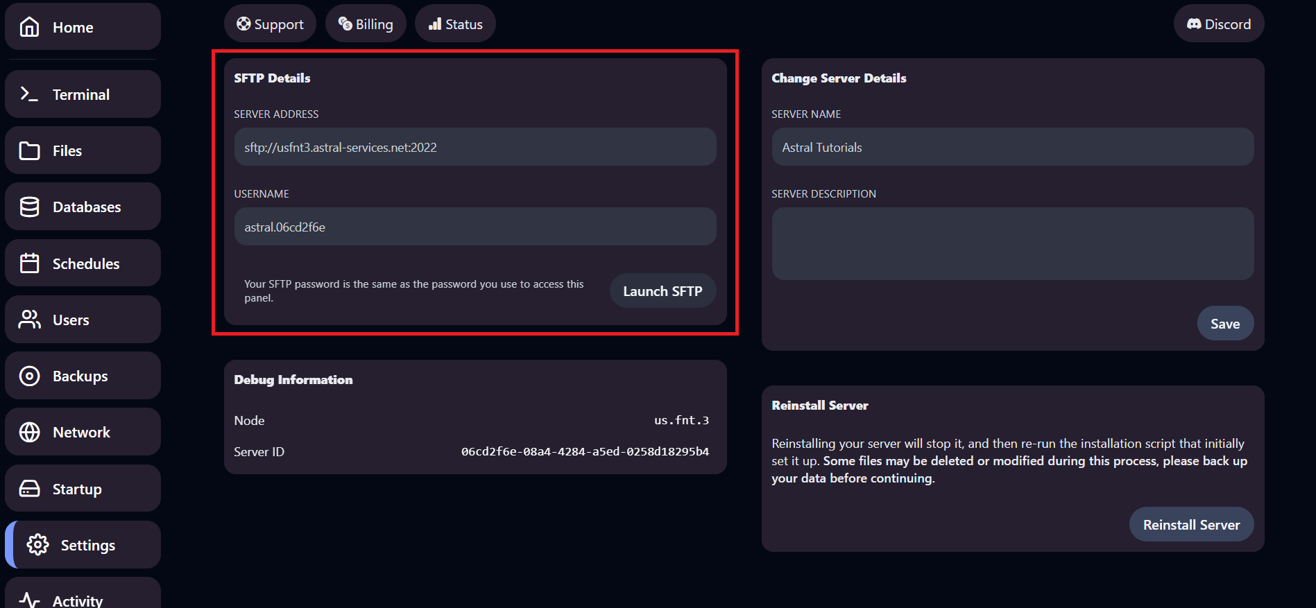 2. Head over to your server panel, and navigate to the "settings" tab on your server. There you will see your FTP login information displayed.