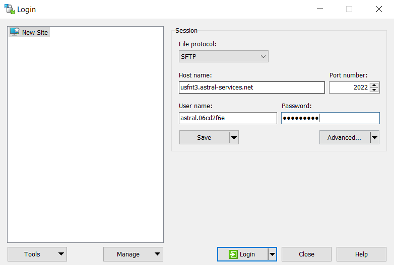 Note: For WinSCP, my host name would be usfnt3.astral-services.net, ignoring the "sftp://" portion as that is just defining the transfer protocol we use. My port would be 2022.
