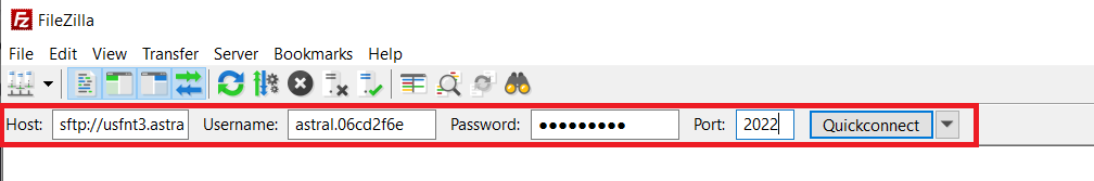 Note: For FileZilla, my host name would be sftp://usfnt3.astral-services.net, as FileZilla needs to have the protocol type defined in the host name. My port would be 2022.